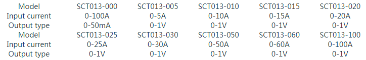 SCT013系列提供多种型号,其测量范围与输出信号类型各不相同。尽管所有型号的物理外观相同,但可通过产品外壳上的标识文字进行区分。