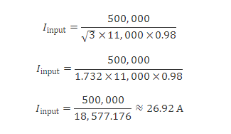 假设您有一个500kva变压器,初级电压为11kv (11000 V),效率为98%。